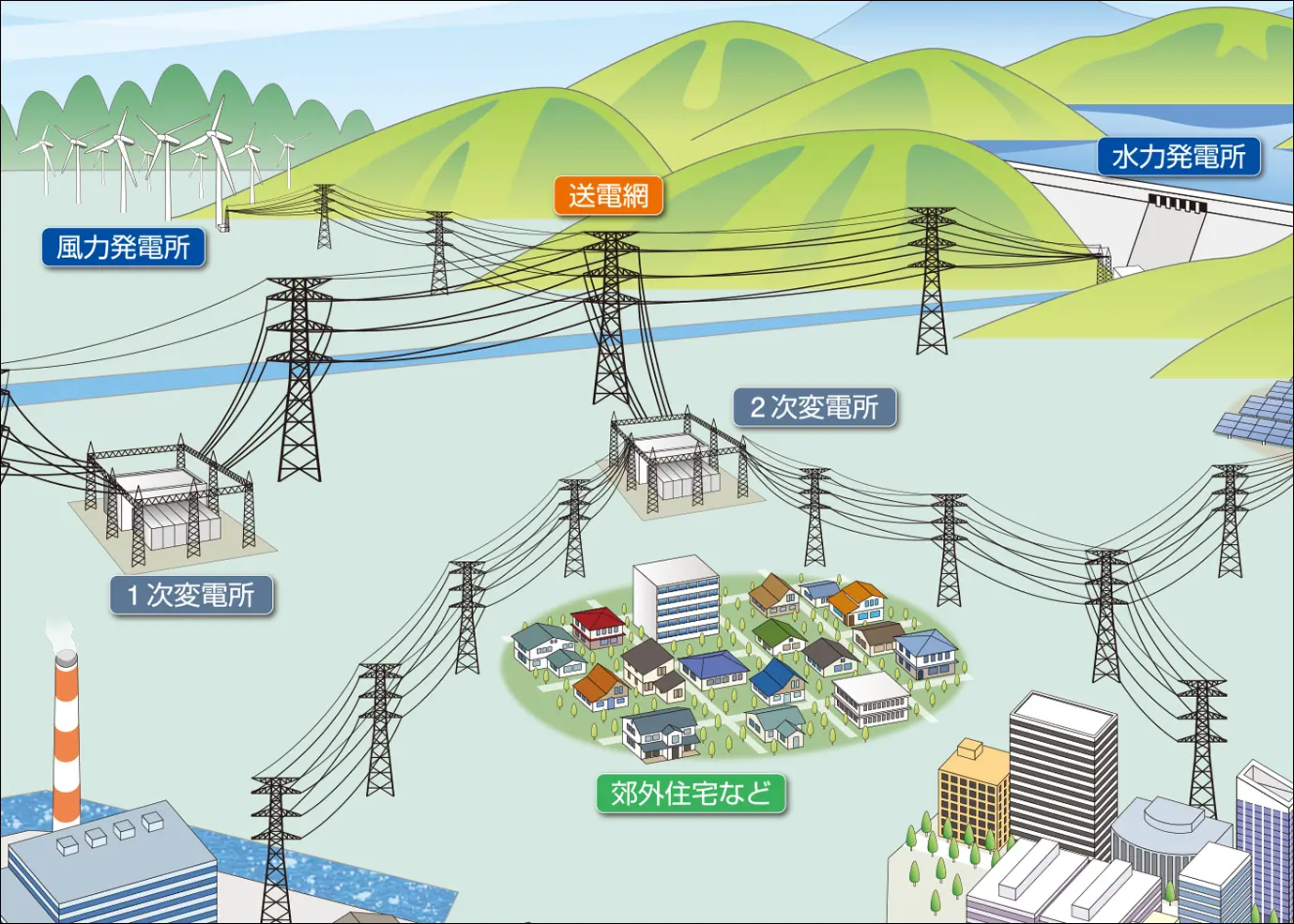 発電所から変電所、あるいは変電所から別の変電所までの道のりを「送電」、変電所から各家庭や工場などに分配、供給することを「配電」といいます。